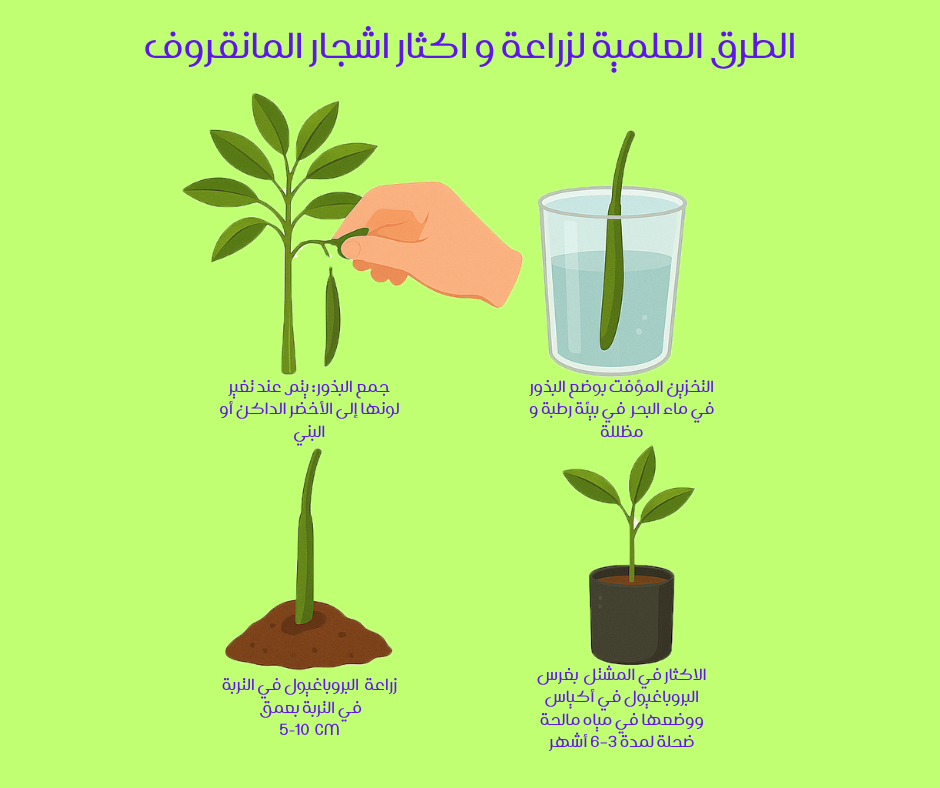 – الإكثار بالبذور (البروباغيول): المانغروف من النباتات النادرة التي تبدأ بذورها بالإنبات وهي لا تزال على الشجرة، وتسمى هذه البذور النابتة بـ البروباغيول.