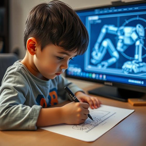 • طفل يكتب رسمة بيديه على ورقة، خلفه شاشة تعرض عمل آلة متقنة، رمزًا للفن الإنساني الذي لا يُختزل بالآلة.