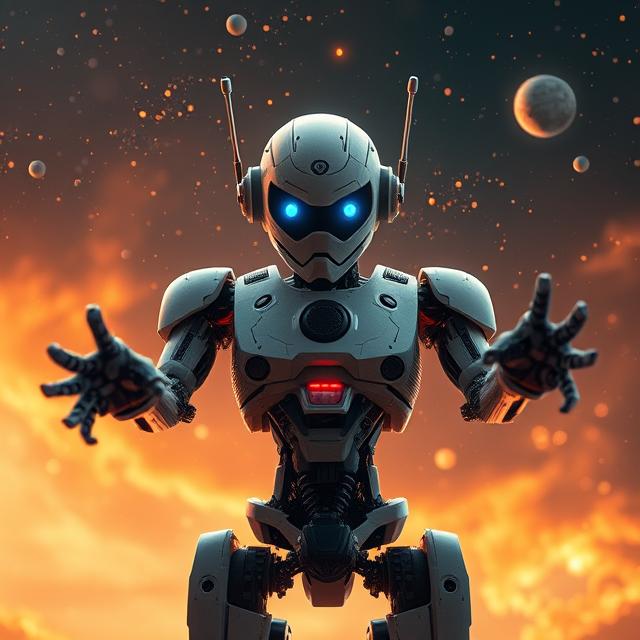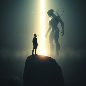 تخيل هذا المشهد: إنسان يقف على صخرة مضيئة وسط ظلام، روبوت ضخم يقابله، نصفه مكون من دوائر وأسلاك، نصفه الآخر ظل غامض بلا ملامح. بينهما شعاع نور متوتر، كأنه سؤال مفتوح عن المصير. هذه صورة رمزية لما يحدث اليوم حيث ان الإنسان معرض للآلة، في عمله وحياته ومعرفته.