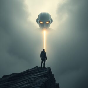 • إنسان يقف على حافة جبل، روبوت ضخم يطل من خلف الضباب، شعاع نور بينهما، يرمز إلى الخيار بين السيطرة والتحرر.