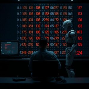 • مكتب مظلم، بشري يجلس أمام شاشة مليئة بالأرقام، كل رقم هو قرار قد يغيّر مصيره، بينما ظل آلي يراقبه بلا تعاطف.