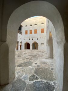 القطيف العوامية – مشروع الرامس – بيت العمدة – ويظهر جمال وتفاصيل الأقواس والأروقة والفناء الداخلي (الحوي) والفتحة السماوية (الشمسة).