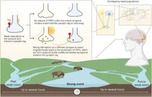 يخلق الحدث البارز ظلًا زمنيًا شبه دائم، يستمر لعدة ساعات قبله وبعده. وفقًا لفرضية التوسيم السلوكي [التوسبم المشبكي “synaptic tagging” هي كيف تعمل التشويرات العصبية في مشبك عصبي معين على إنشاء موقع لمنتج مرتبط باللدونة العصبية(3) (PRPs)] فلو أثار حدث بارز الخلايا العصبية المجاورة، فإنها تُفرز بروتينات لها علاقة باللدونة العصبية يمكن التقاطها بواسطة هذه الوسم المشبكي العصبي (synsptic tag) ، ما يجعل هذه الذاكرة مستقرة وطويلة الأمد. لكن لو لم لم تُثار الخلايا العصبية المجاورة، فإن هذه الذكريات الضعيفة تتلاشى بمرور الزمن. تشير الفرضية إلى أن كلاً من المكونات المكانية والزمانية في النشاط العصبي ضرورية لتقوية الذكريات الضعيفة في البداية، سواءً حدثت أو على وشك الحدوث.