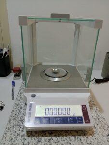 تُوزن العينة بدقة عالية باستخدام ميزان إلكتروني حساس تصل دقته إلى 0.00001 غرام، وذلك لأن نتيجة التحليل تعتمد بشكل كبير على دقة الوزن. يتم تدوين وتسجيل الوزن في ورقة خاصة قبل بدء الفحص، مع التأكد قبل بداية وزن العينة من أن مكان الوزن خالي تمامًا من أي تيارات هوائية أو اهتزازات قد تؤثر على قراءة الميزان.