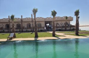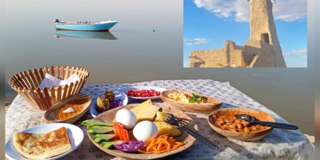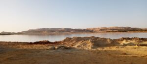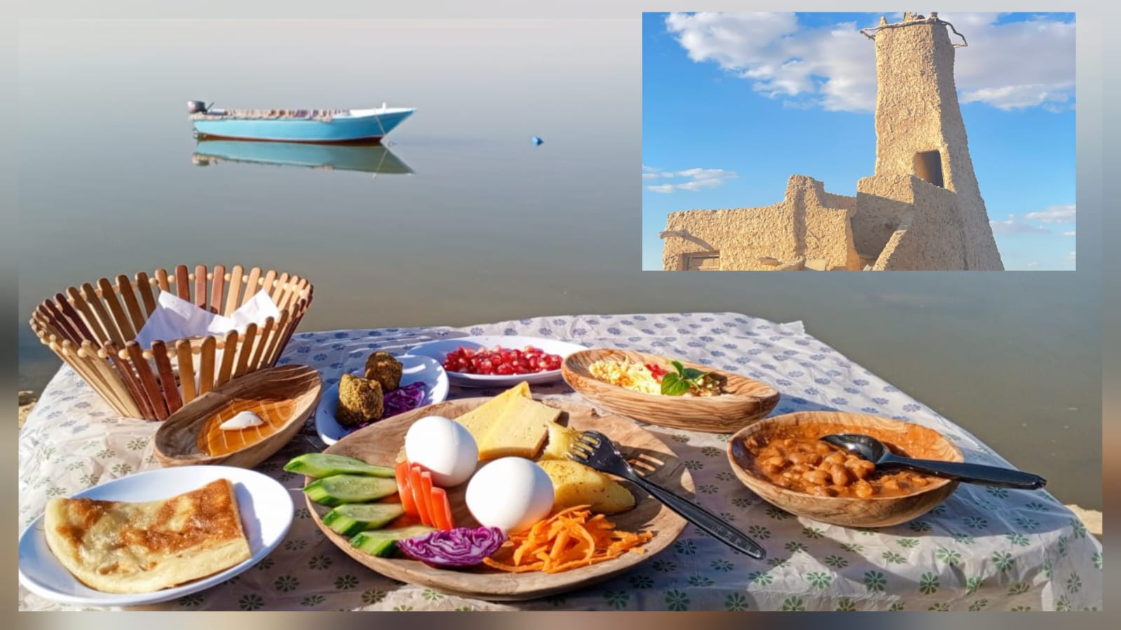 واصلنا السير، وفي الطريق رأينا كيف تلتقي اليابسة بالبحر في عناقٍ صامتٍ وساحر. على أطراف الشاطئ انتصبت نخيل شامخة تُطل على الماء كأنها تناجي البحر فيهمس لها بصوت أمواجه الهادئة. كانت البحيرة رقراقة ساكنة، بلا أمواج، يلفّها سكونٌ يبعث الطمأنينة في النفس.