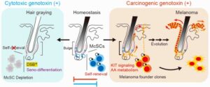 هذه الخلايا، الموجودة في بصيلات الشعر، وتحت تأثير عوامل سمية أو مجهدة (داخلية أو خارجية)، قد تؤدي إلى إجهاد جيني سام يُلحق الضرر بالحمض النووي، ما يعرض سلامة الجينوم إلى الضرر(3)، ولهذا لابد لها أن تواجه قرارًا حاسمًا، إما أن يبقى تصبغ الشعر الأصلي، أو يتغير إلى رمادي أو أبيض (كما في حالة شيب الشعر)، أو إلى الإصابة بورم خبيث (كما في حالة الورم الميلانيني).