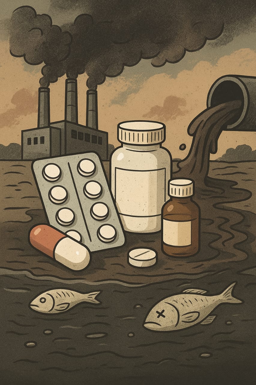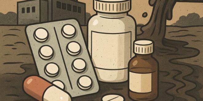 تُعد صناعة الأدوية أكبر ملوث كيميائي في العالم، حيث تُطلق حوالي 100 ألف طن من المركبات الصيدلانية النشطة سنويًا في الهواء والمياه والتربة، بينما تستهلك طاقة تعادل ضعف صناعة الطيران العالمي، مساهمة بـ 4.4% من الانبعاثات الكربونية. ثمة أكثر من 700 مركب دوائي في الأنظمة المائية بتراكيز تفوق الحدود الآمنة بـ 100-1000 مرة، وتولّد 25 مليون طن من النفايات الخطرة، 70% منها يُحرق أو يُدفن مما يُطلق ديوكسينات مسرطنة.