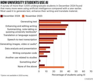 ولكن ما الغرض من استخدام الطلبة للذكاء الاصطناعي؟ في استطلاع رأي لأكثر من 1,000 طالب في المملكة المتحدة أجراه معهد سياسة التعليم العالي (HEPI)، وهو مركز أبحاث في أكسفورد بالمملكة المتحدة، كان معظمهم، كما هو متوقع، يستخدمون أدوات الذكاء الاصطناعي لكتابة النصوص أو تحسينها أو تلخيصها (انظر الرسم البياني “كيف يستخدم طلبة الجامعات الذكاء الاصطناعي”).