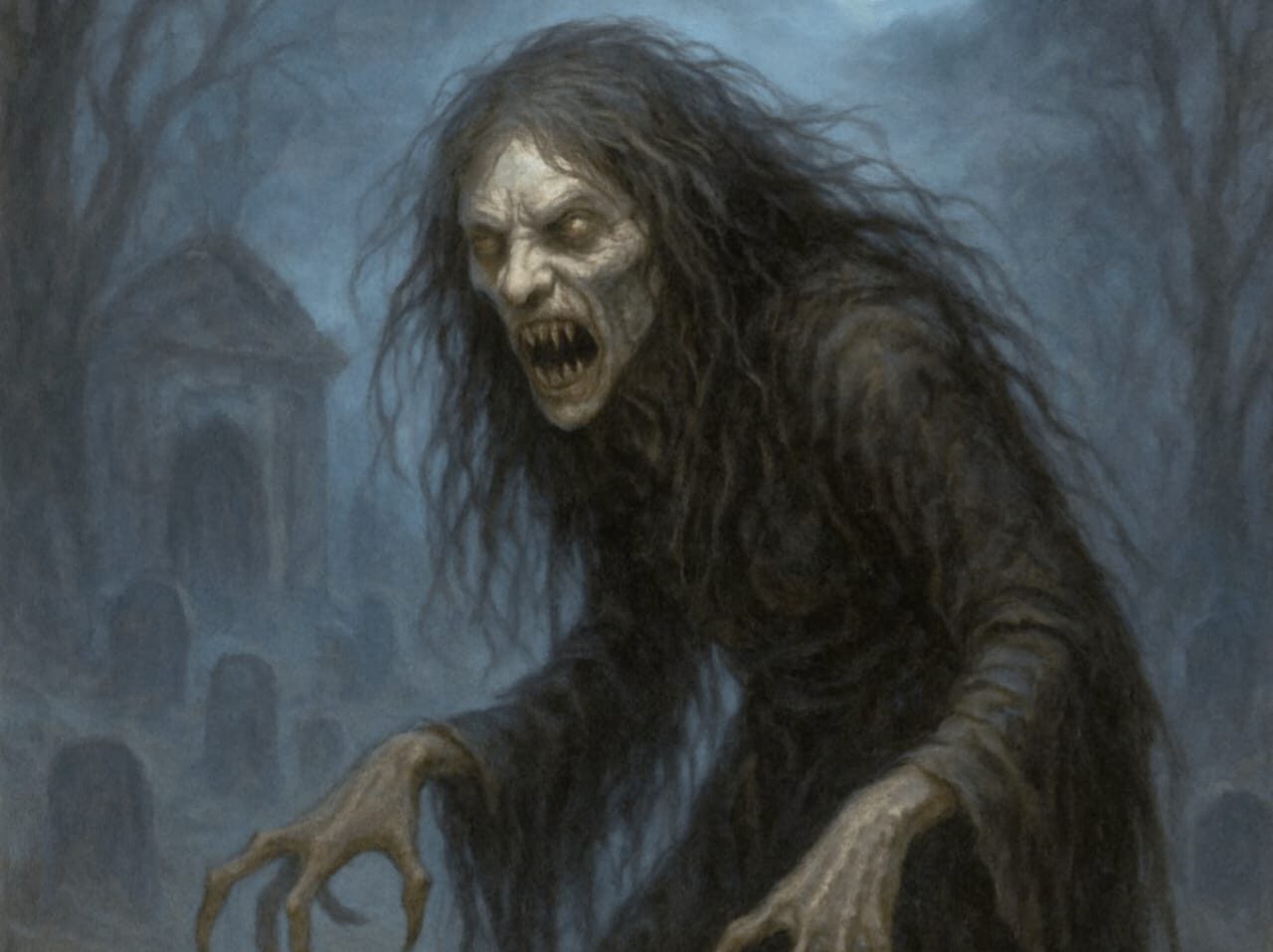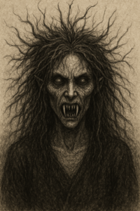 يُقال إن السعلوة كانت امرأةً اختلطت ملامحها بين الآدمي والوحشي؛ شعرٌ متشابك كأغصانٍ جفّ عنها الماء، أنيابٌ طويلة تشقّ فمها كحدّ سكين، وعينان تشبهان قنديلاً قديمًا انطفأت فيه النار، وبقي فيه بريقُ الرماد.