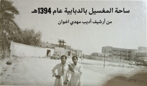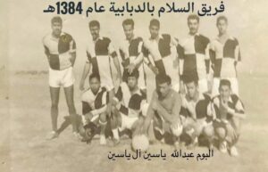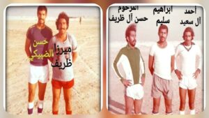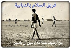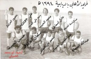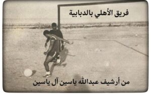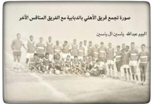 (من اليمين): المرحوم الكابتن عبد الله بن عبد الله آل ياسين ” أبو جهاد ” المتوفى عام (1423هـ)، أحد لاعبي فريق الأهلي بالدبابية، يظهر وهو يصافح لاعبي الفريق المنافس من محافظة الأحساء، حيث انتهت المباراة بفوز فريق الأهلي الدبابية(7).