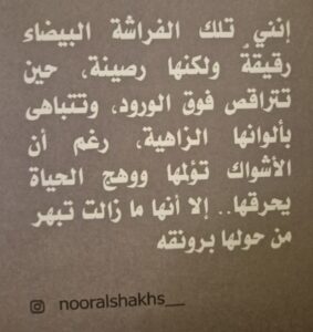 الكتاب: هذا الكتاب قد يشارككم لحظات الكاتبة الجميلة ولحظاتها العصيبة…. ومن خلالها قد تجد إنارة تفتح لك أبوابا جديدة وتكون مفتاح الأمل في حياتك… وتدرك أن كل مر سينتهي وكل شيء قابل للتغيير إن امتلكنا الإرادة.