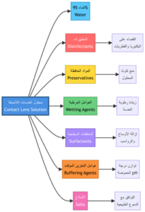 تتكون محاليل العدسات اللاصقة من مزيج معقد من المواد الكيميائية التي تعمل معاً لتوفير بيئة آمنة وصحية للعدسات. تشمل المكونات الرئيسية ما يلي: