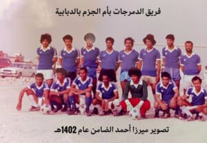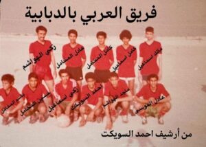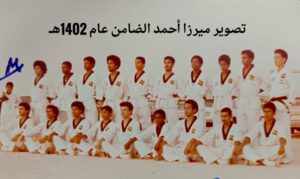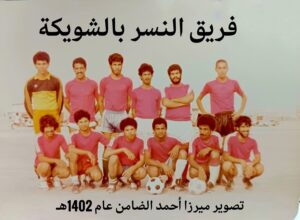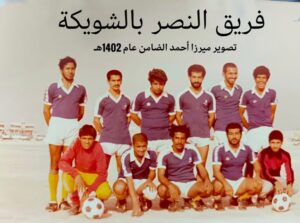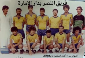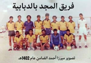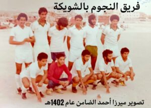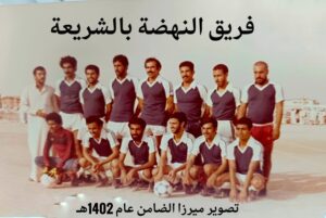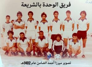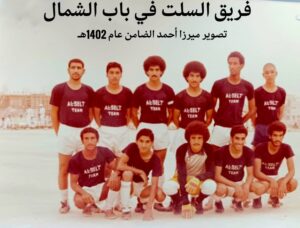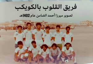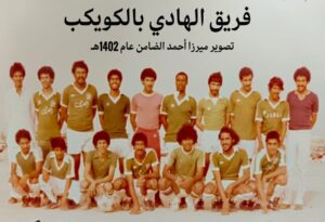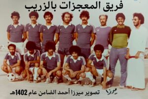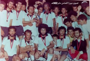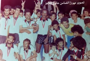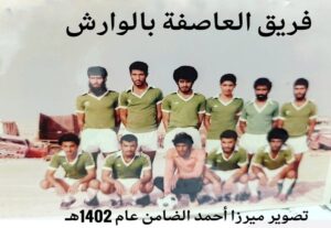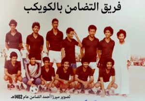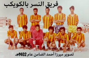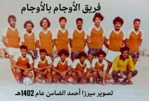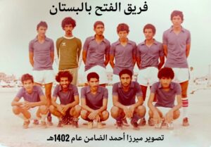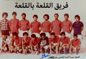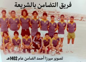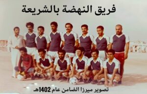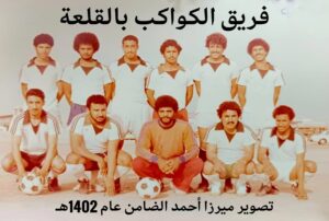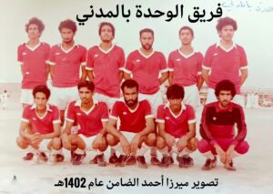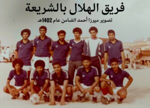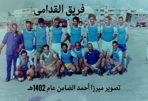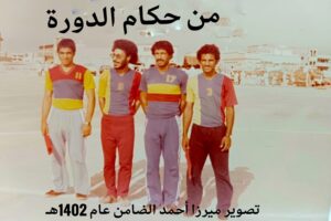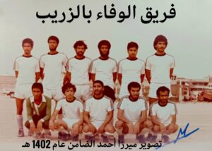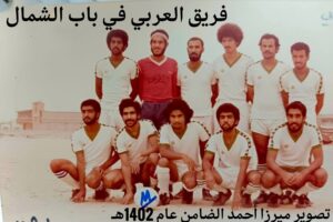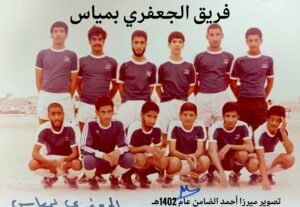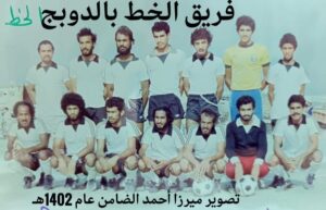 (الوقوفً من اليمين): 1-حسين المروحن 2- حميد سلمان عبد الهادي الحبيب 3- حسن الغريافي 4- احمد سعود حمد 5- عبداله الرويس 6- عبد الجليل المحسن 7- السيد محمد الحواج 8- الحكم سعيد الشنخنخ.