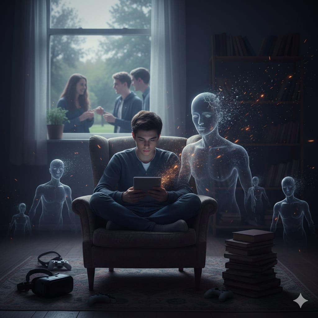 يكمن جوهر تدهور الصحة النفسية والعاطفية في افراغ البنية الاجتماعية الواقعية (غير الانترنتية)، التي تدعم النمو الاجتماعي السليم والتفاعل الاجتماعي الجيد مع الآخرين، وبذلك تضعف تدريجيًا، مما يُقلل من فرص النمو الاجتماعي السليم والمباشر حين أصبحت حياتهم الاجتماعية هشة وضعيفة بعد أن استبدلت الحياة الطبيعية المباشرة بالحياة الرقمية وتراجعت المشاركات المجتمعية وازدادت العزلة الاجتماعية رغم التواصل الرقمي.