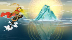 يستخدم هذا الشكل “عيون الحقيقة النارية(3)” الشهيرة لسون ووكونغ (ملك القرود) كاستعارة لأخذ عينات من عملية الانتباه المنتظمة والمتكررة، موضحًا كيف يُعدِّل الوعي البصري هذه العملية. تُصدر عيون سون ووكونغ النارية إشارات مركزة تشبه الأشعة باتجاه جبل جليدي – نصفه ظاهر فوق سطح البحر (حالة الوعي البصري) ونصفه الآخر مغمور تحته (حالة اللاوعي البصري).