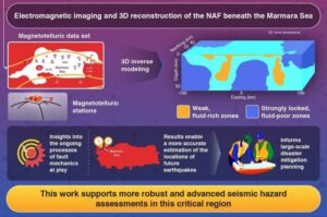 وفقًا لباحثين من مركز العلوم في طوكيو، يكشف نموذج ثلاثي الأبعاد جديد للصدع تحت بحر مرمرة في تركيا عن مواقع محتملة لوقوع زلزال كبير في المستقبل. وباستخدام القياسات الكهرومغناطيسية، رسم الفريق خرائط لبنى خفية تُساعد في فهم كيفية بدء الزلازل ومواقع التصدعات المحتملة في هذه المنطقة.