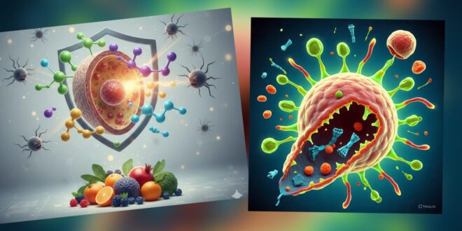 تعمل مضادات الأكسدة كمنظومة دفاعية متكاملة، حيث تقوم بالتبرع بإلكترون للجذور الحرة دون أن تفقد استقرارها، مما يكسر سلسلة التفاعلات التأكسدية ويحمي النسيج الخلوي. ومع ذلك، فإن هذا النظام يعمل ضمن توازن دقيق جداً يُعرف بـ “التوازن الاختزالي” (Redox Homeostasis)، حيث يحتاج الجسم إلى قدر ضئيل من الجذور الحرة كإشارات حيوية، وأي تدخل غير مدروس لزيادة مضادات الأكسدة بشكل مفرط قد يؤدي إلى نتائج عكسية مدمرة.