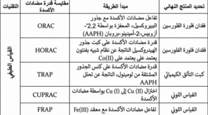 - مقياس (FRAP): يقيس القدرة على اختزال الحديد، وهو مؤشر جيد للقدرة على التبرع بالإلكترونات.