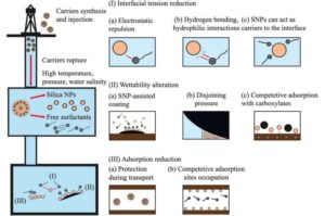 وثانيًا، انخفاض التوتر عند السطح الفاصل بين الماء والنفط. وثالثًا، زيادة قابلية ترطيب الصخور الكربونية بالماء، مما يُسهّل إزاحة الماء للنفط. وفي جميع هذه الجوانب الثلاثة، عززت جزيئات السيليكا النانوية تأثير مادة خفض التوتر السطحي.