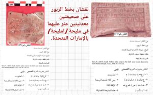 في هذه المنطقة تم العثور على عدد من نقوش الخط المسند الذي كان حينها متداول في هذه المنطقة وقد وثقها الدكتور السعيد في “مدونة نقوش شرق الجزيرة العربية القديمة” كما وصنفها في المركز الثالث في الخليج العربي من حيث عدد مكتشفات النقوش فيها بشكل عام إذ بلغ عددها تسعة نقوش ومن بينها نقشين بخط الزبور فيبقى سبعة من نقوش المسند.