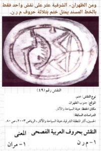نتابع الآن مسيرنا شرقاً وننعطف بعدها نحو الجنوب لنصل إلى الظهران من جهتها الجنوبية حيث تم العثور على نقش واحد فقط يشكل ختم بيضاوي الشكل وقد نقشت عليه كلمة واحدة فقط بالخط وهي م ر ن بمعنى: مران ويحمل هذا النقش الرقم الرسمي (٤٩) والجهة المحتفظة به هي هيئة السياحة والآثار.