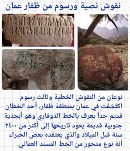 كما سبق ذكره في استثناء احصائيات مكتشفات المسند في عمان لكونها متاخمة للحدود اليمنية وكذلك وجود التواصل الثقافي والتجاري المباشر فعمان ليست في عزلة عن حضارة جنوب الجزيرة في ذلك العصر ومع ذلك فإن أعداد المكتشفات فيها يعتبر قليل جداً لاتصالها بالمصدر مباشرة وانتقال كتابة الخط المسند منذ وقت مبكر لذا فإن ظفار الواقعة جنوب عمان كانت الأكثر تأثراً وارتباطاً حضارياً وسياسياً بممالك الجنوب لدرجة ان بعض الباحثين يرجحون أنها كانت ضمن النفوذ الحميري في فترات معينة، فبذلك قد توطد الجسر الثقافي الممتد بينهما، ومن الملامح الثقافية المشتركة هي كثرة وجود الخط المسند في ظفار وهي أكثر المناطق العمانية تأثراً وأكثرها استعمالاً لخطوط المسند حيث عُثِر على أغلب النقوش المسندية الصخرية فيها وكان أغلبها عبارات قصيرة احتوت على أسماء أشخاص وقبائل وإشارات دينية وتجارية.