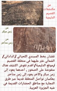 وانتقالا من أقصى الطرف الجنوبي للمنطقة الوسطى الى أقصى طرفها الشمالي – تحديداً ووصولاً إلى القصيم التي تم العثور فيها على نقشين دادانيين (لحيانيين) من الخطوط المسندية الشمالية القديمة وذلك في موقع الدليمية والتي نُقِشت على صخرتين وهي من أقدم النقوش المسندية الدادانية أحدهما بخط مبكر والآخر بخط متأخر.