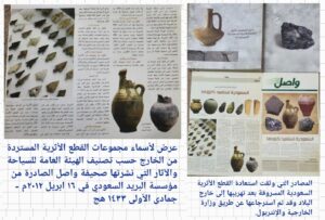 2. “دليل المعرض الأول للقطع الأثرية السعودية المستعادة” : وهو بحث في كتاب قام بجمعه وطبعه مجموعة من خبراء الهيئة العامة للسياحة والآثار.