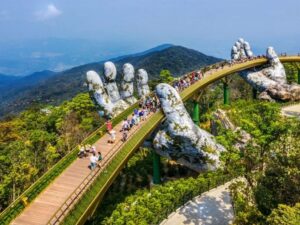 ويقود إلى هذا المكان أحد أطول خطوط التلفريك في العالم، حيث تتحوّل الرحلة نفسها إلى تجربة بصرية آسرة، تتبدّل خلالها الغابات والغيوم والارتفاعات في دقائق معدودة. ويبرز في هذا المشهد الجسر الذهبي، ذلك الممرّ المعلّق الذي تحمله أيادٍ حجرية عملاقة، وكأنه جسرٌ خارج من الأساطير، يربط بين الغيوم والجبال.