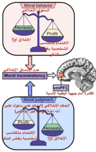 لدى الذين يتسمون بالاتساق الأخلاقي – أي الذين يقيمون أنفسهم ويقيمون الآخرين وفقًا للمعايير الأخلاقية نفسها – كان نشاط منطقة القشرة أمام جبهية البطنية الإنسية (vmPFC) في كل منهما متماثلًا خلال كلٍ من المهام السلوكية (التي قاموا بها أنفسهم) والتقييمية (التي قيّموا فيها سلوك الآخرين). أما لدى المشاركين غير المتسقين أخلاقيًا – أولئك الذين قيّموا ممارسة الآخرين للغش بأنها مارسة غير أخلاقية، بينما كانوا متساهلين في تقييمهم ممارستهم الغش – فقد كان نشاط منطقة القشرة أمام جبهية البطنية الإنسية أضعف خلال نفس المهمة السلوكية، وكان مدى اتصاليتها بمناطق الدماغ الأخرى المنخرطة في اتخاذ القرارات والأخلاق أضعف.